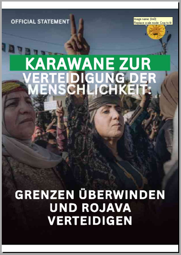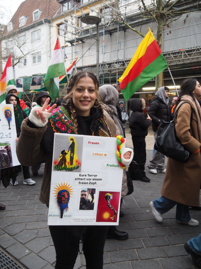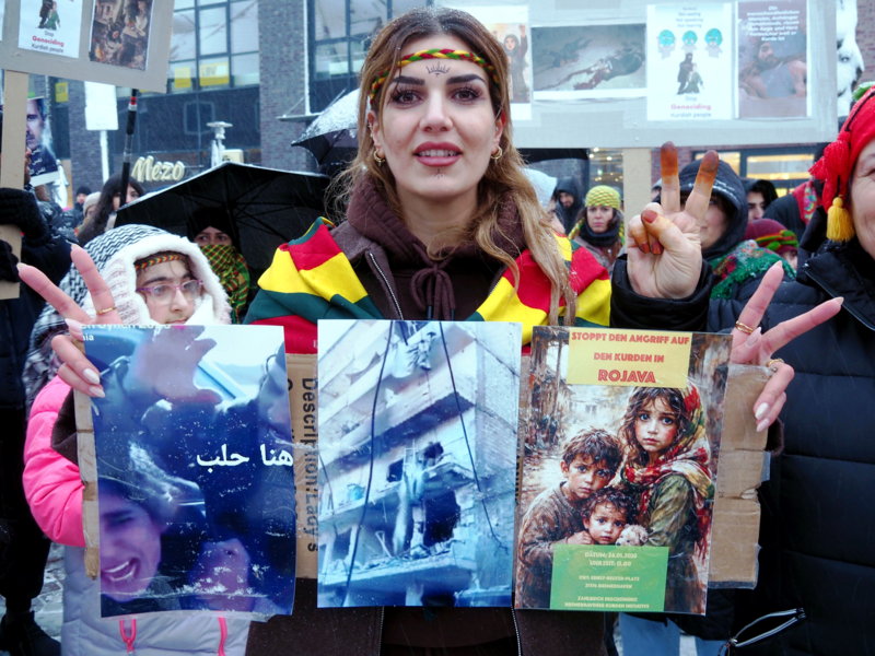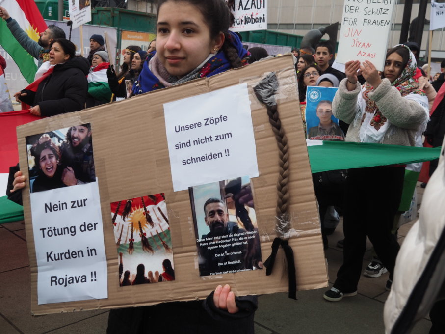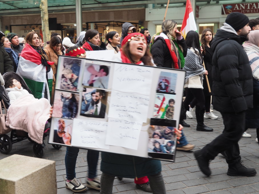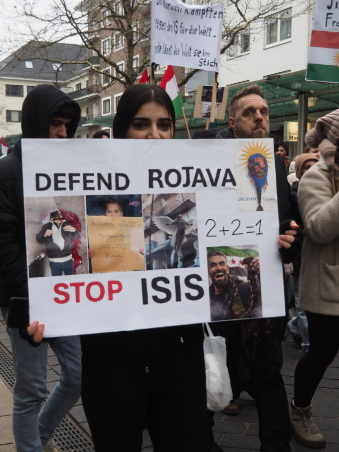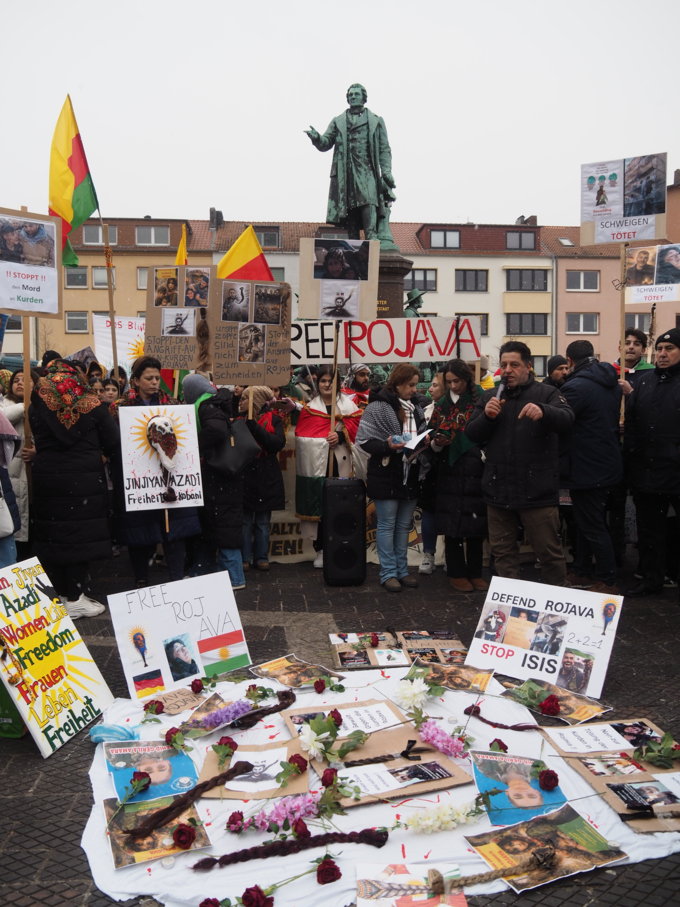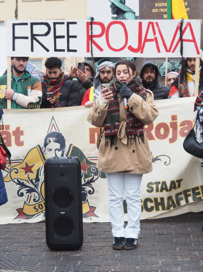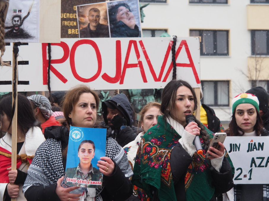 Die Teilnehmenden forderten ein sofortiges Ende der islamistischen Offensive, den Schutz der Zivilbevölkerung in Rojava und ein Aussetzen jeglicher EU-Unterstützung für das Regime in Damaskus.